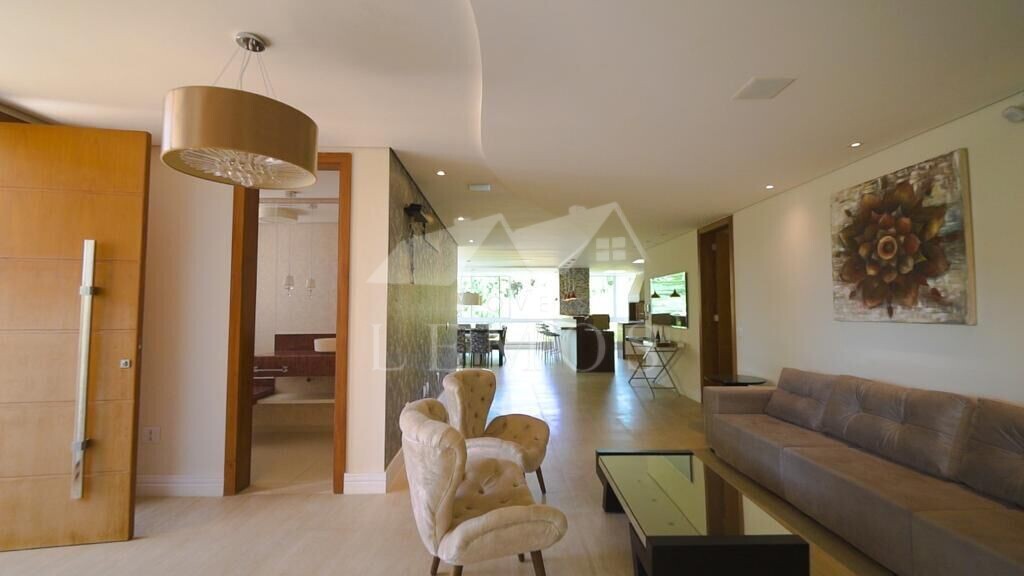 A disposição do imóvel contém 5 suítes, 4 cozinhas maravilhosas, 2 churrasqueiras (1 interna, 1 externa), pontos de ar-condicionado, lustres finos, persianas elétricas em todos os dormitórios com sacada. Sala de estar com projetor/cinema com surround, 1 sala gourmet, 10 banheiros, salão de jogos, Piscina grande com uma vista maravilhosa para área verde, sauna, quadra de futebol de grama sintética, jardim frontal e lateral. Sem vizinhos laterais (paralelo), Garagem para 4 carros (2 cobertas). Fino acabamento, pintada recentemente.